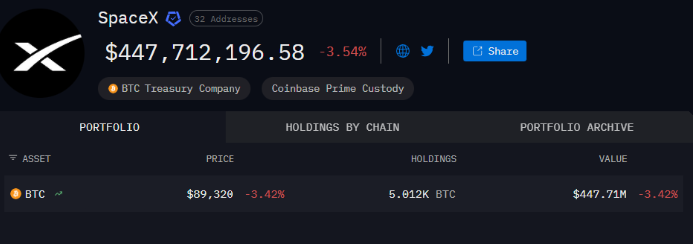 A pesar del revuelo viral que aseguraba que la compañía había transferido "todas" sus participaciones, la realidad es bien distinta. SpaceX aún posee más de 5.012 BTC, por un valor estimado de 448 millones de dólares. Esto significa que menos de la mitad de los Bitcoins rastreados propiedad de la compañía se han movido realmente.